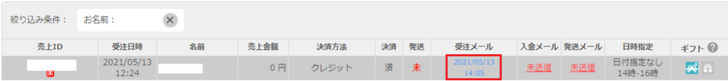 グレーアウトになっていることを確認し、受注メールの日付を押下する。
